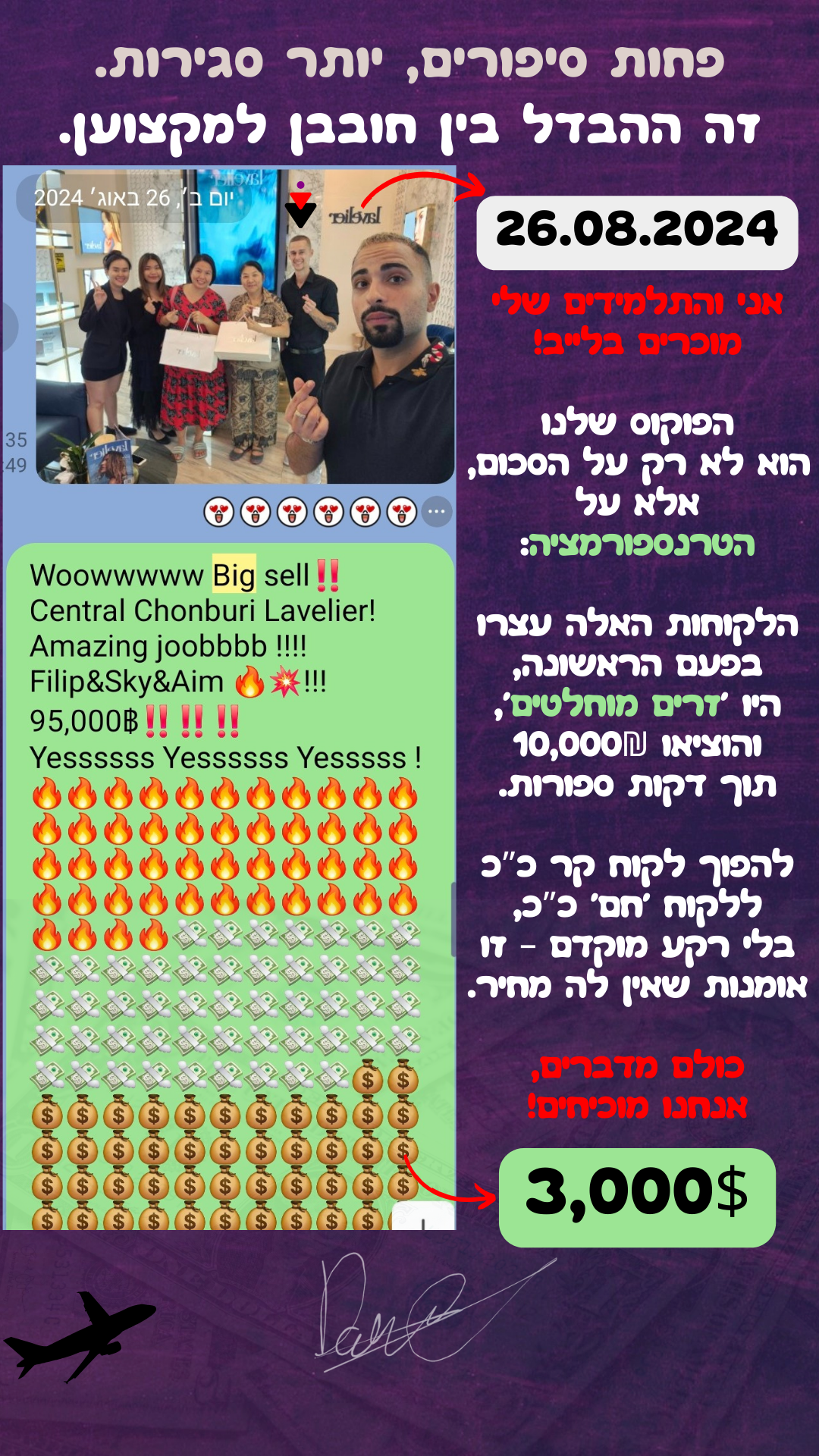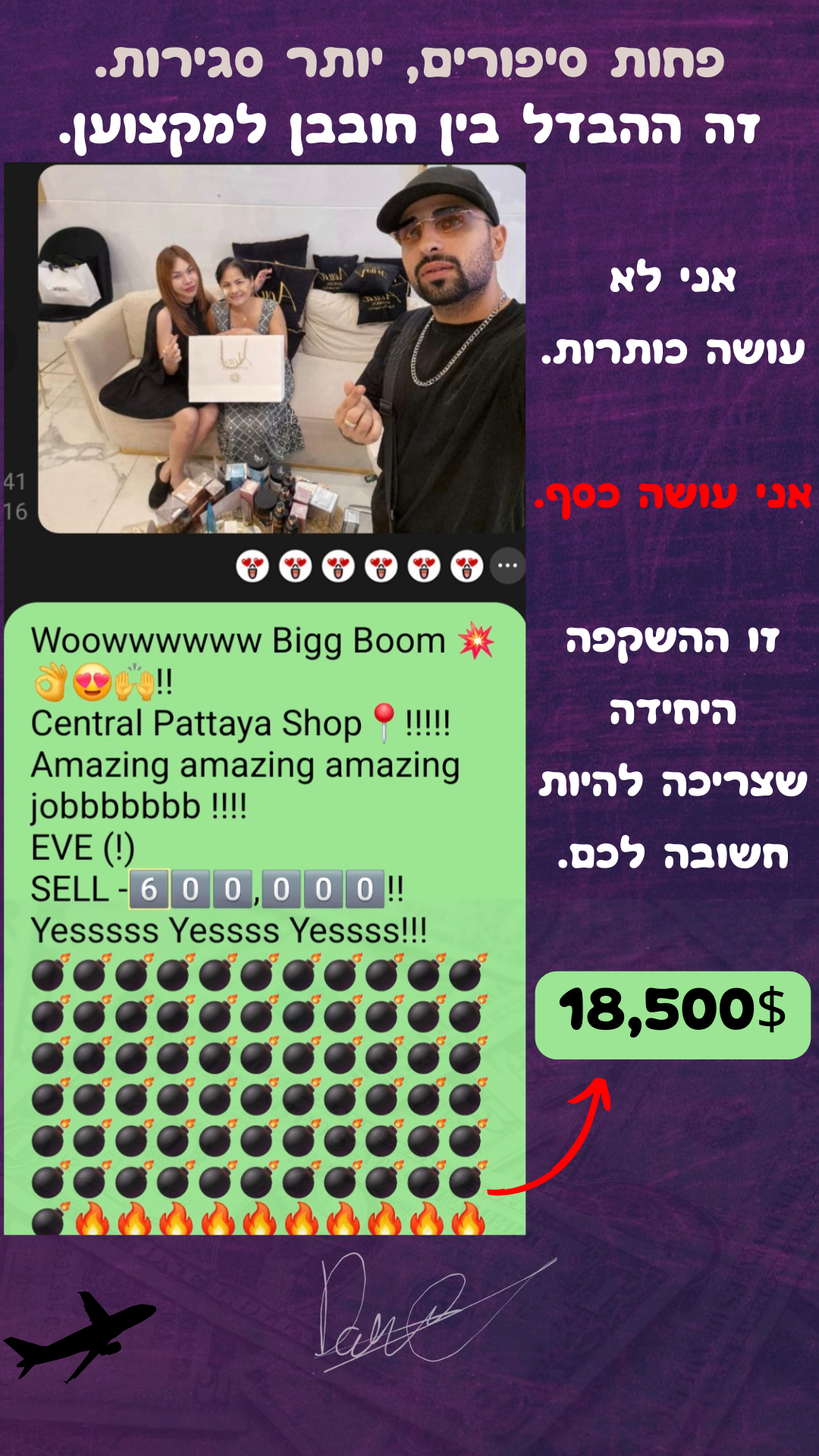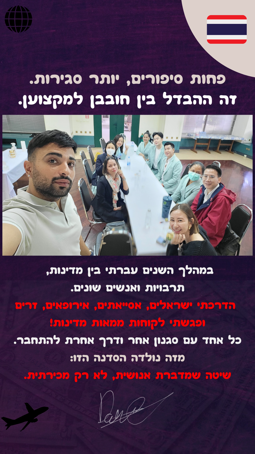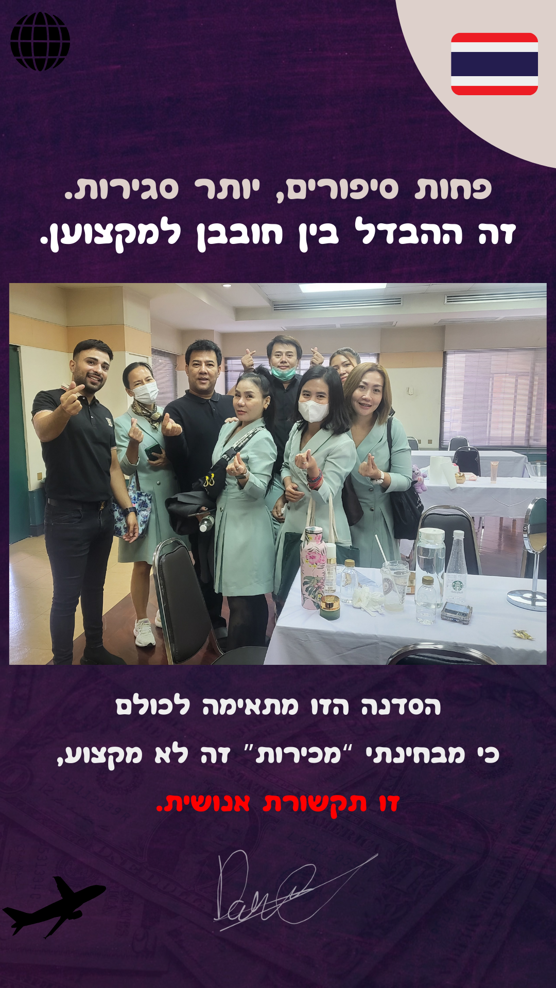 סצנת תאילנד יום אחד, נעליים רטובות, קניון מפוצץ. ביד ימין סגרתי 5,000 דולר, וביד שמאל החזקתי מוכרת שבכתה מפחד. וזה מי שאני: לא רק סוגר עסקאות, אלא גם פותח לבבות.