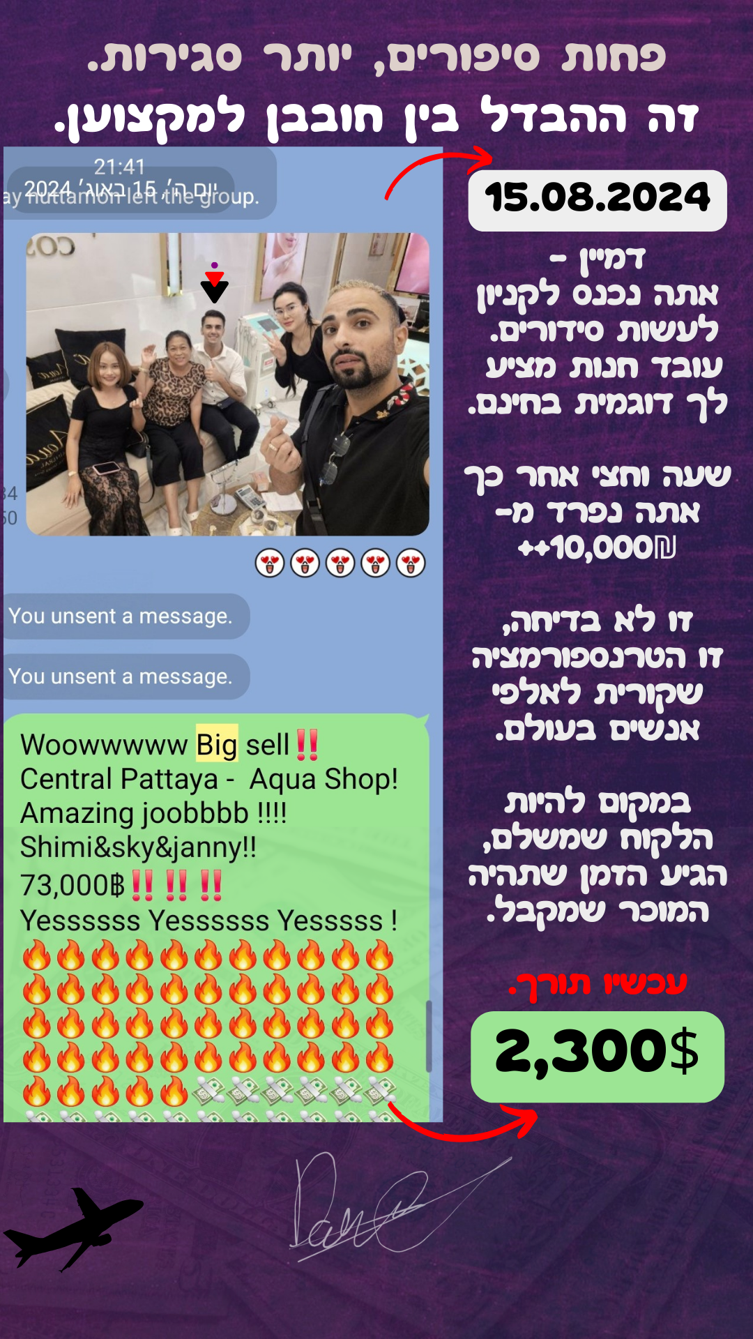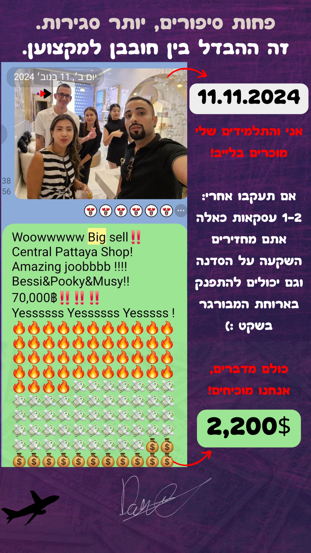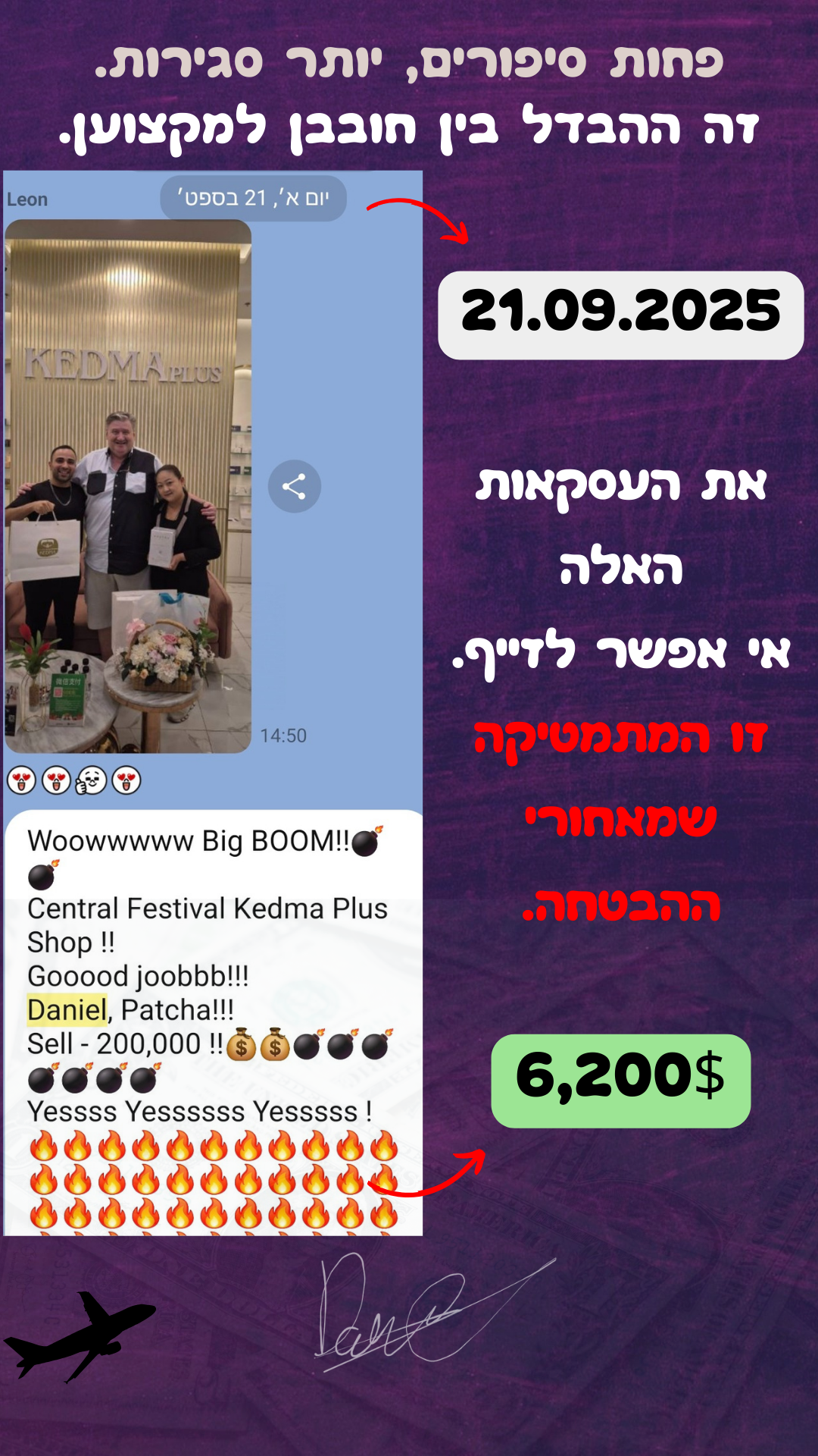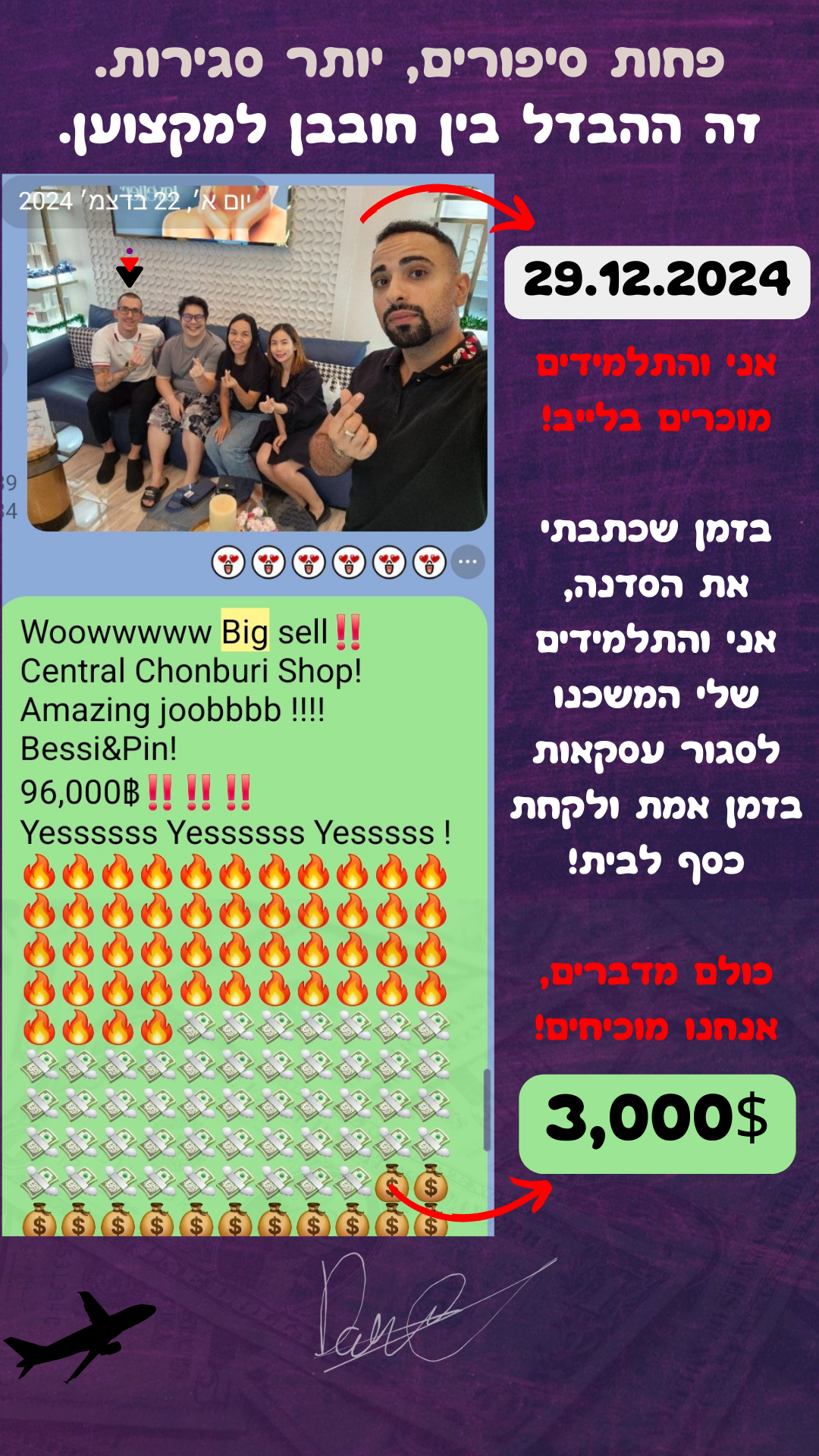 סצנת תאילנד יום אחד, נעליים רטובות, קניון מפוצץ. ביד ימין סגרתי 5,000 דולר, וביד שמאל החזקתי מוכרת שבכתה מפחד. וזה מי שאני: לא רק סוגר עסקאות, אלא גם פותח לבבות.