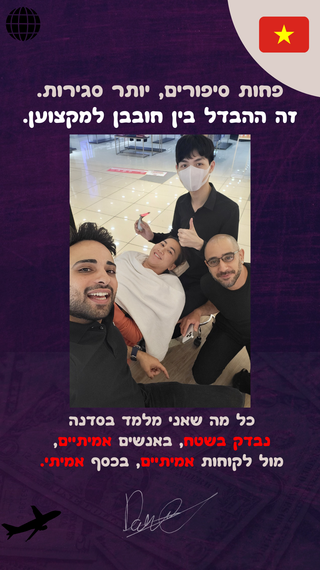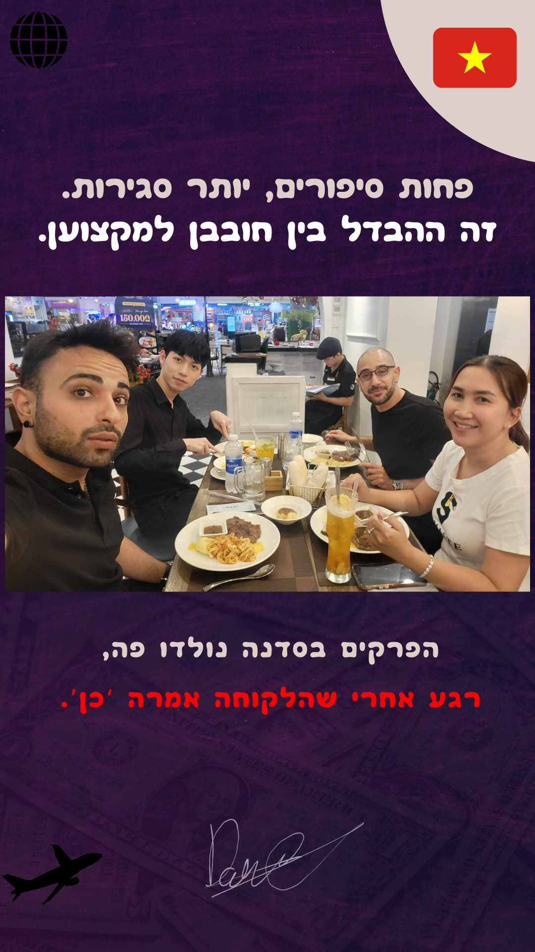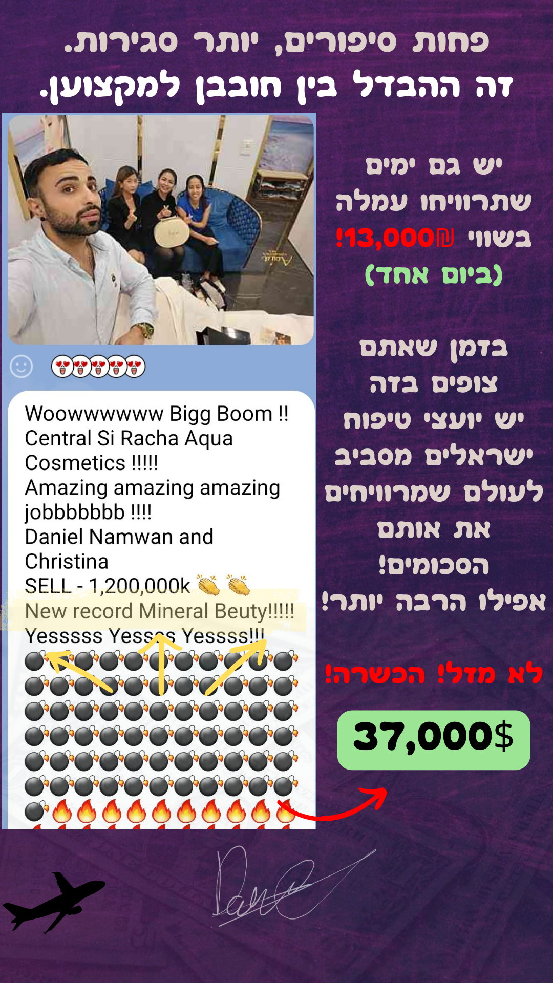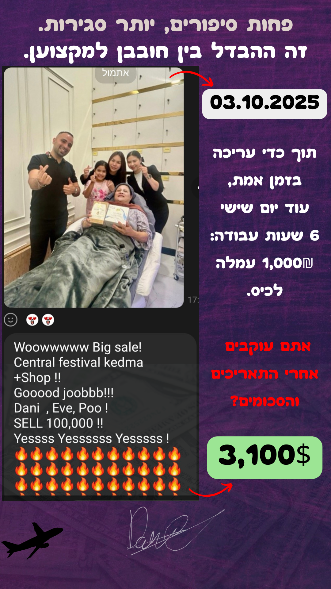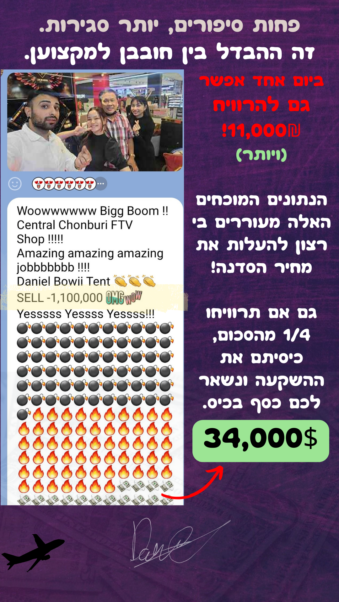 סצנת תאילנד יום אחד, נעליים רטובות, קניון מפוצץ. ביד ימין סגרתי 5,000 דולר, וביד שמאל החזקתי מוכרת שבכתה מפחד. וזה מי שאני: לא רק סוגר עסקאות, אלא גם פותח לבבות.